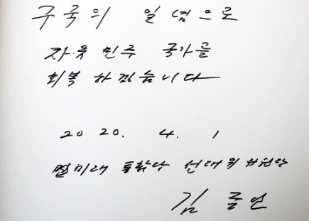 "구국의 일념으로 자유민주 국가를 회복하겠습니다. 2020. 4. 1"이라고 쓴 뒤 자신의 직책과 이름을 적는 순서에서 '민'자를 썼다가 지우고 '미래통합당 선대위 위원장 김종인'이라고 적었습니다.