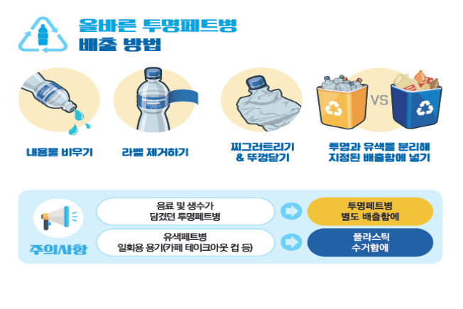 타 플라스틱에 비해 고부가가치가 높고 재활용률이 높은 투명 페트병을 별도로 분리해 자원재활용에 활용하기 위해서 다 함께 올바르게 배출합시다.