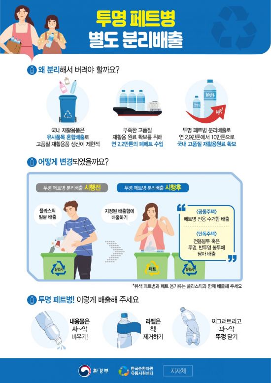 단, 글자 및 상표가 페트병 겉면에 인쇄되어 있거나, 색이 들어간 유색페트병 등은 지금처럼 일반 플라스틱과 혼합하여 배출하면 되며, 이렇게 별도 배출된 투명페트병은 기능성 의류, 가방 등의 고품질 재활용 원료로 재활용된다.