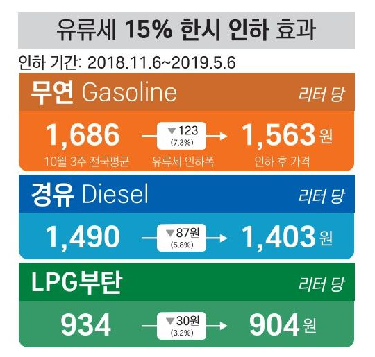 이번달부터 6개월간 휘발유·경유·액화석유가스(LPG)·부탄 등에 대한 유류세가 한시적으로 15% 인하