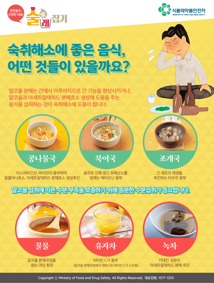 북어국, 콩나물국, 재첩국, 조개국, 유자차, 꿀물, 녹차, 헛개나무즙 등등